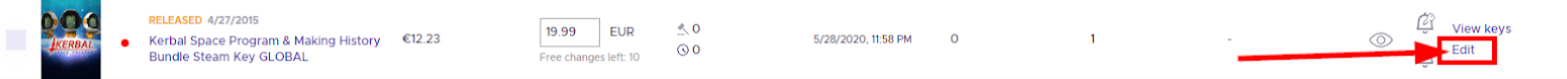 To make further changes—such as adjusting notifications, price settings, automated price rules, or managing key files (delete/download), or to enable/disable a listing—locate the specific offer and click the ‘Edit’ button.