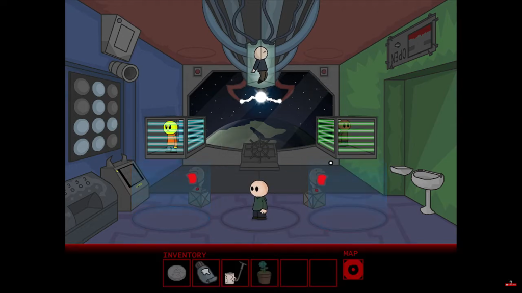 The next stop is the Life Transferring Station. Click on the power panel in the center and place all four screws into their matching slots. Put the potted dirtflower on the left counter marked “Living Thing,” then combine the steak with the tray of dirt and place the resulting pile on the right counter labeled “Dead Animal”. Press the green arrow button. The machine revives the steak into a “living steak,” an item that seems bizarre until you realize aliens eat living meat.