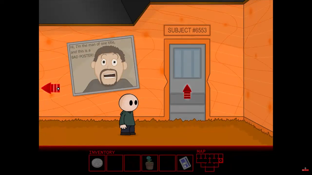 Through the green portal lies a hallway with several rooms. Start by entering the room labeled SUBJECT #7272 to pick up the key card on the floor. Next, enter the flower room to grab the potted dirtflower and the small tray. Scoop some dirt into the tray; this makeshift planter will combine with other items soon. Finally, head into the room labeled SUBJECT #1831, hover your cursor over the right wall, and click when the text reads “hidden door”. Inside the secret alcove is a raw steak that will play an unexpected role later on.