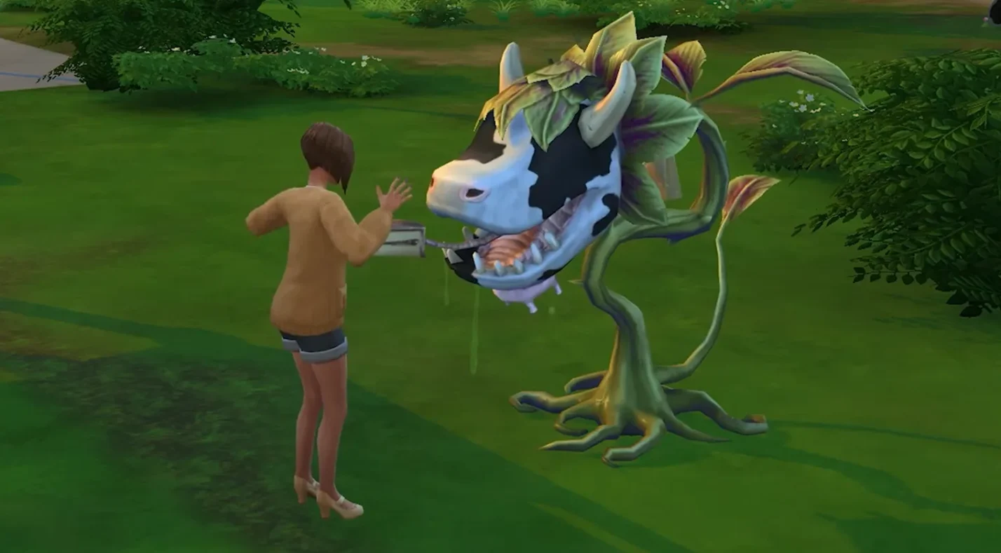 After a Sim takes the cake, the plant may swallow them. The first time, the Sim will be spit out covered in slime; the second time, within a short period, the cowplant will eat them, and a skeletal tombstone appears. This base‑game death is both bizarre and amusing, and the resulting ghost has a leafy aura.
