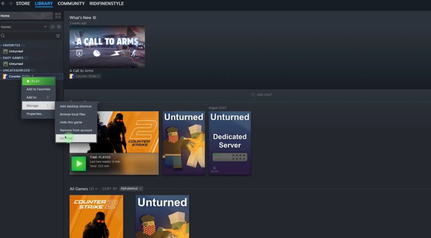 Open your Steam client and head to your library. Find the game you want to uninstall in the list, then right-click on it. Select “Manage” from the dropdown menu to open the game management panel.