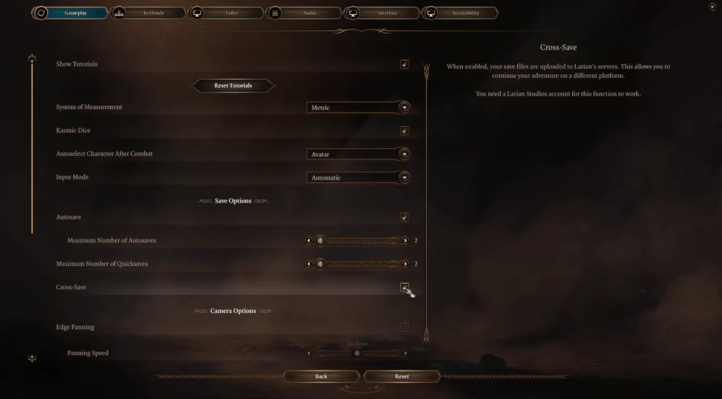 - Under Save Options, enable Cross‑Save. A box will appear indicating that your last five saves will sync to the Larian cloud.