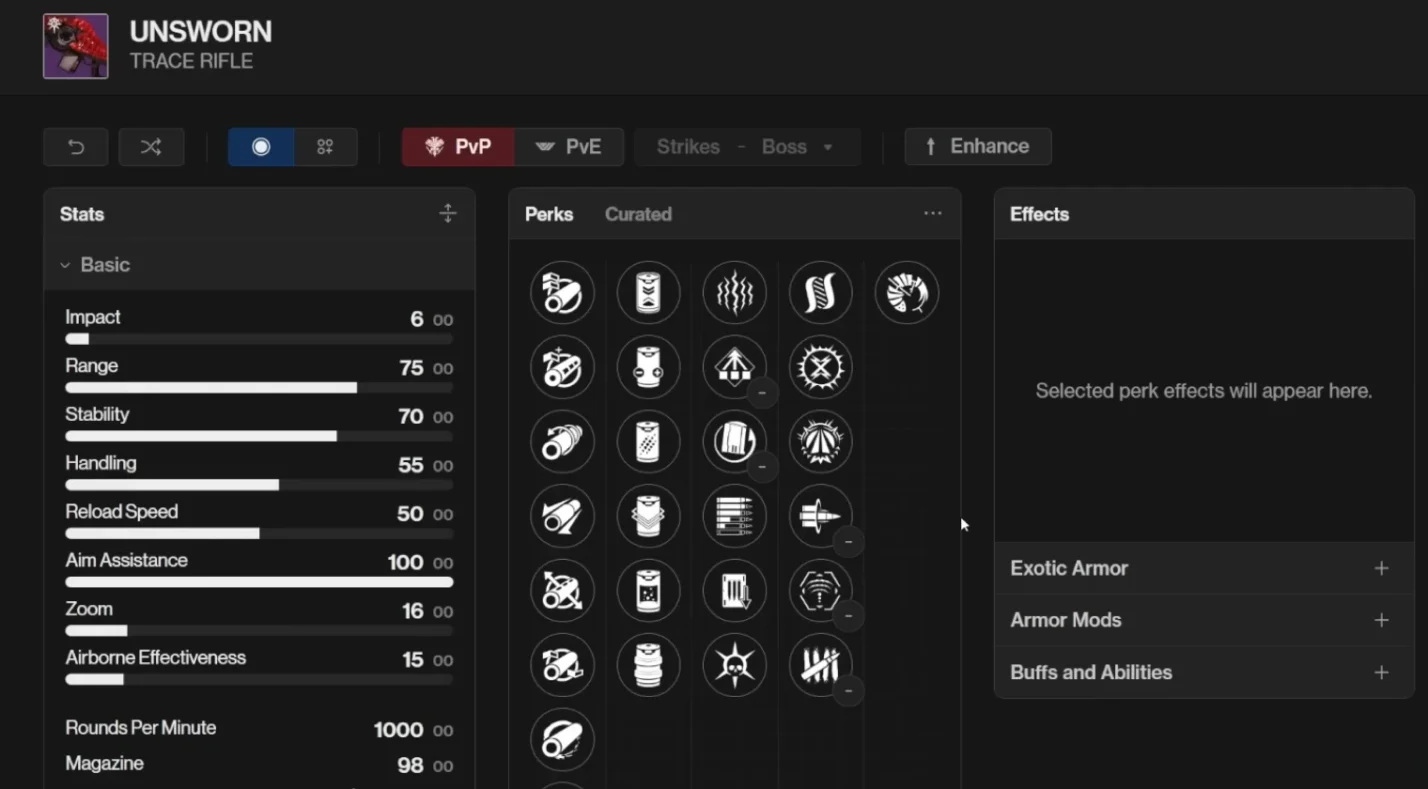 Unsworn is a Strand trace rifle with an adaptive frame. It offers perks such as Tear, Stats for All, Target Lock, and Bait and Switch. Trace rifles are versatile for both boss damage and add control, and Unsworn’s Strand element pairs nicely with suspend and unravel effects. It can drop in all three encounters, which makes repeated farming worthwhile.
