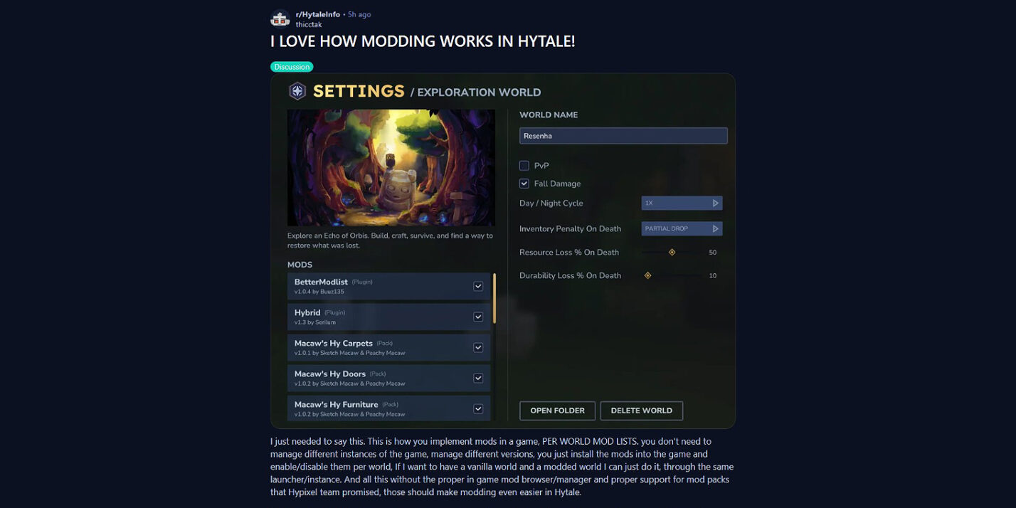 Like Minecraft, Hytale also has a strong focus on mods, but the way it implements them is one of the key factors that’s exciting many gamers. For starters, mods work on a per-world basis, so they can be installed for a specific world and then checked/unchecked accordingly. This means a new world can be created with as many mods as a player likes, rather than a new world for each mod.